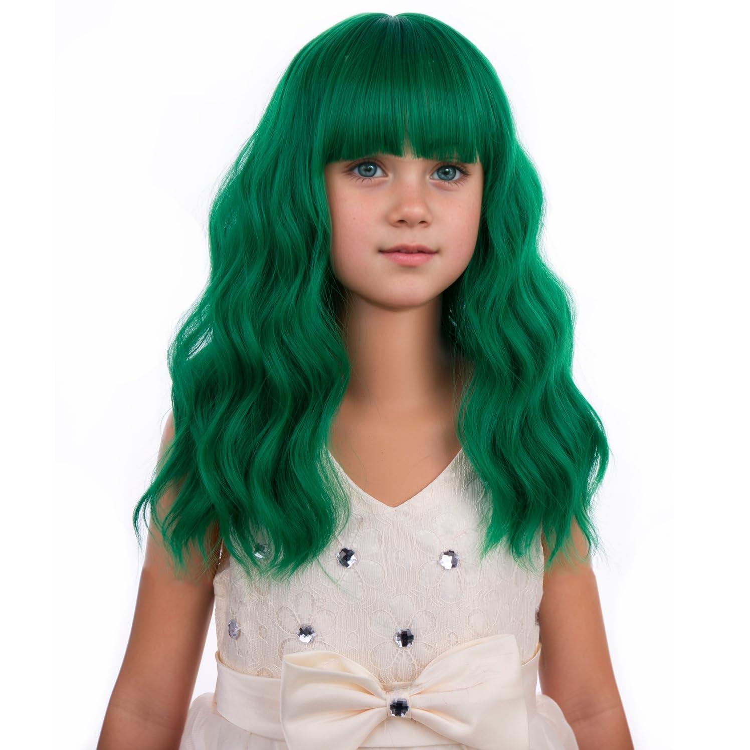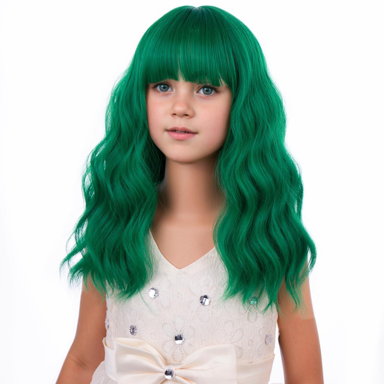 Black Kids Child Wig Shoulder Length Black Wavy Wigs with Bangs for Gilrs Heat Resistant Synthetic Girls Wig Daily Wear Wigs(Green)