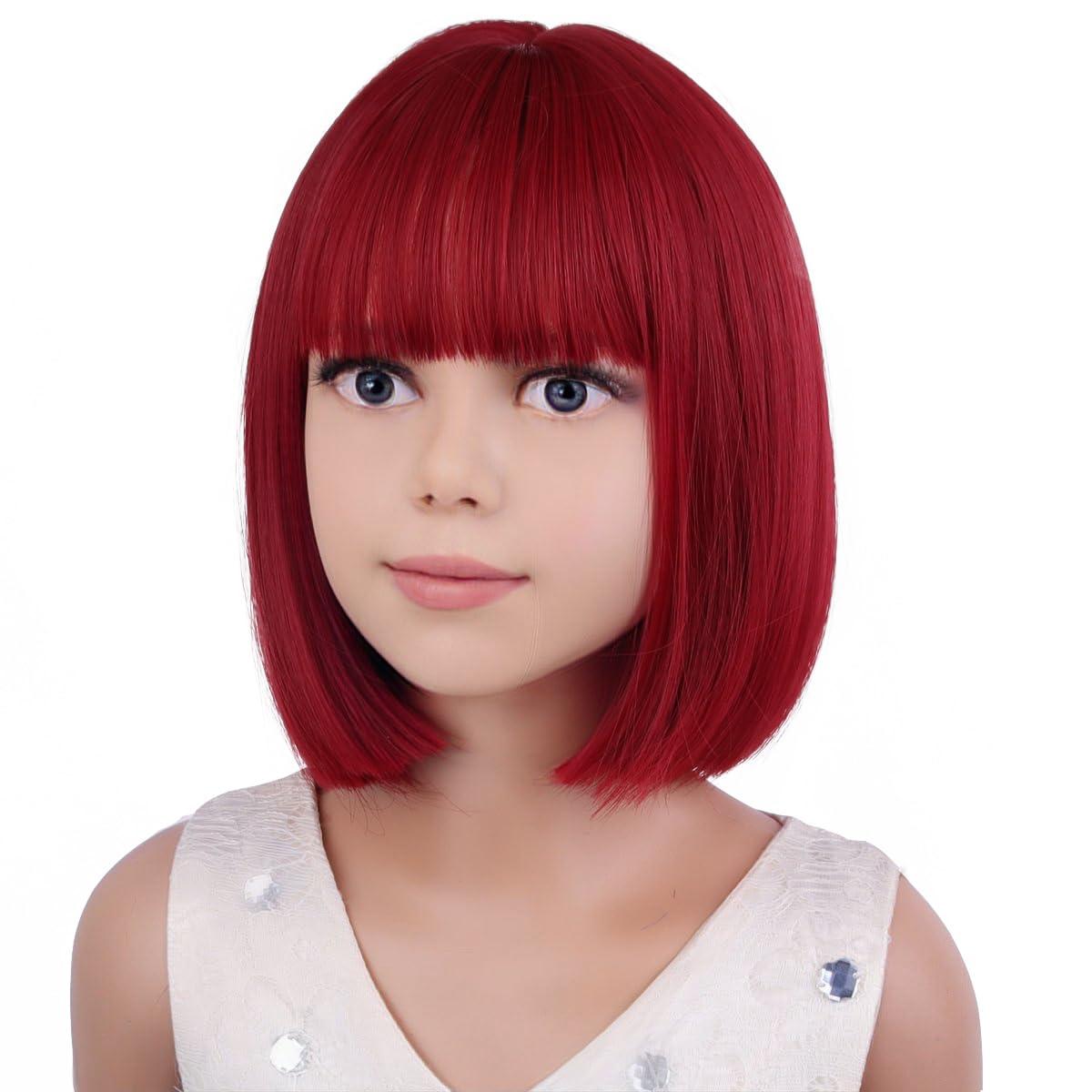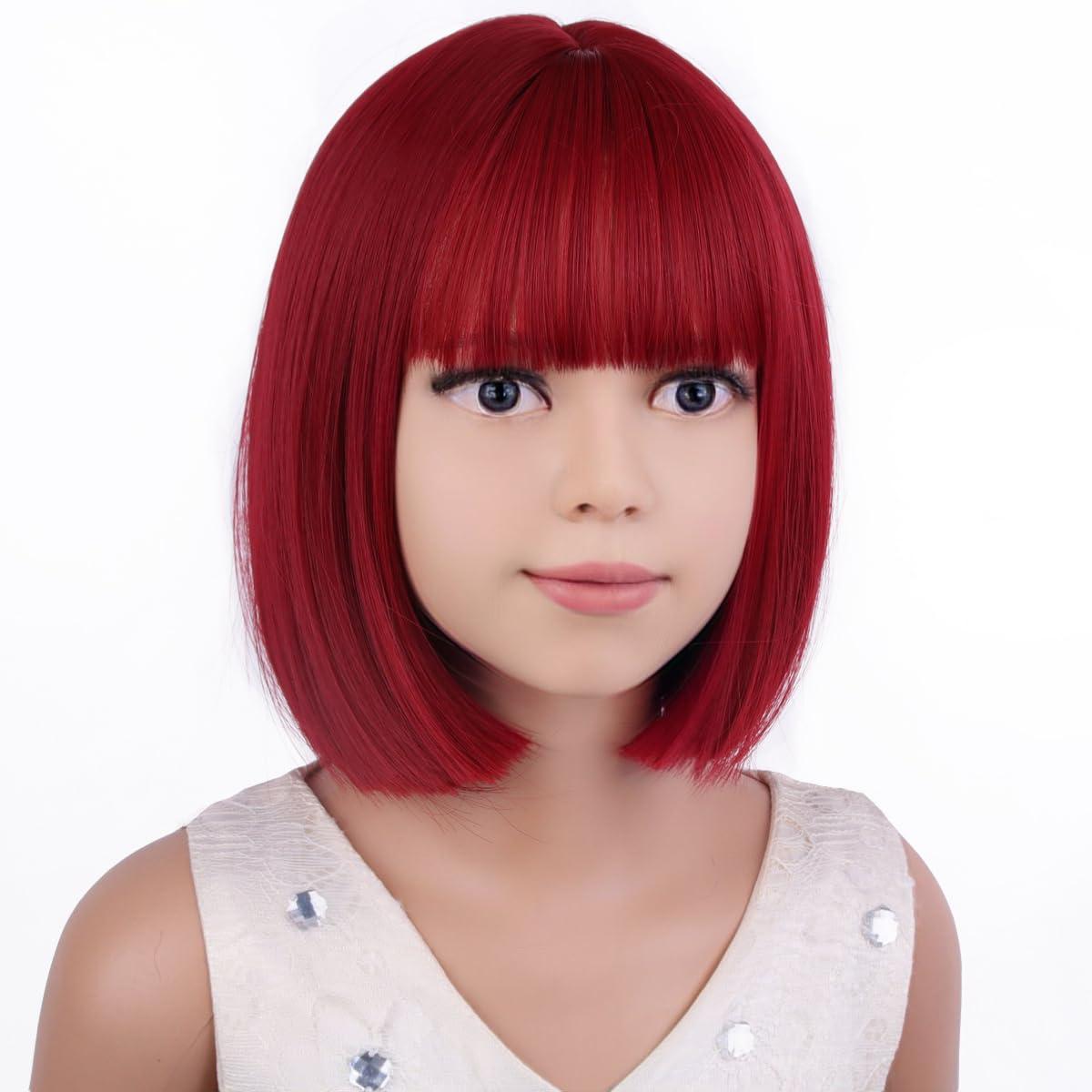 Kids Brown Wig with Bangs Child Short Brown Bob Wig for Girls Cosplay Party Synthetic Rose Net Daily Wear(Wine Red)