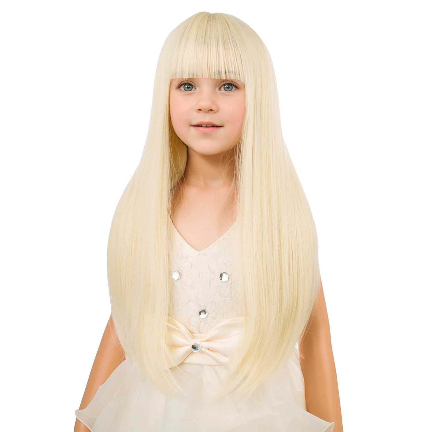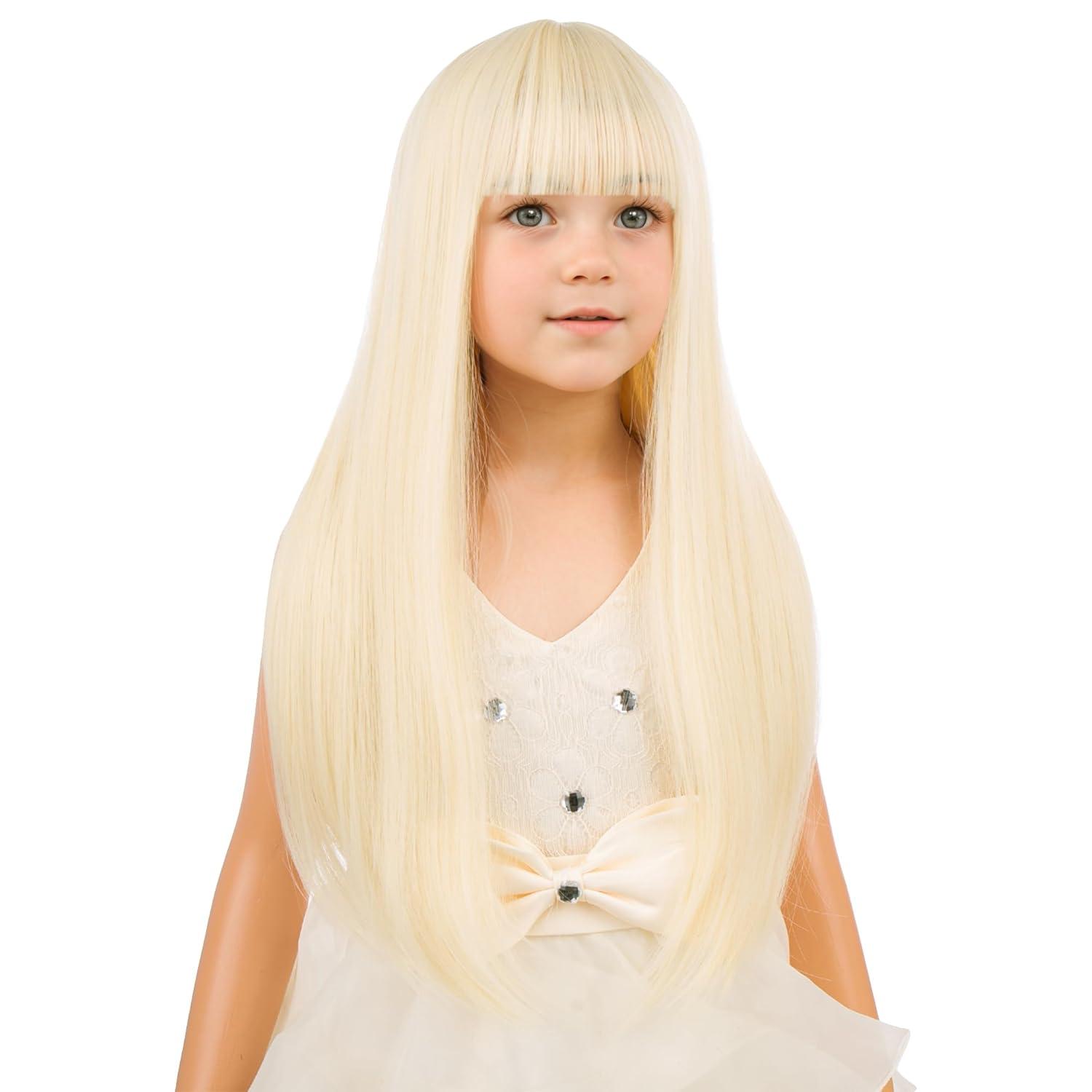 Kids Long Straight Blonde Wig with Bang Child Girls Blonde Long Wigs Synthetic Cosplay Party Synthetic Rose Net Wig(Blonde)