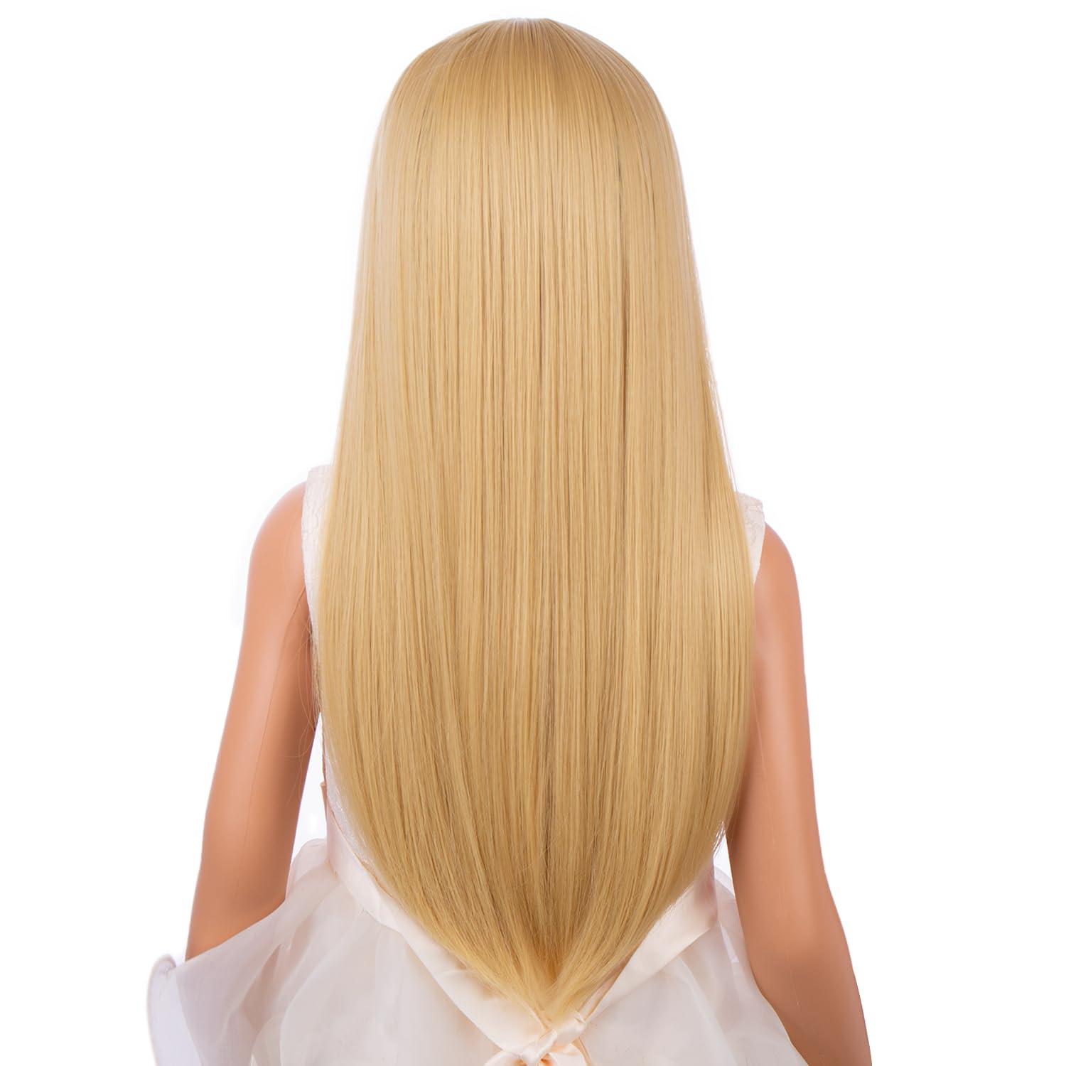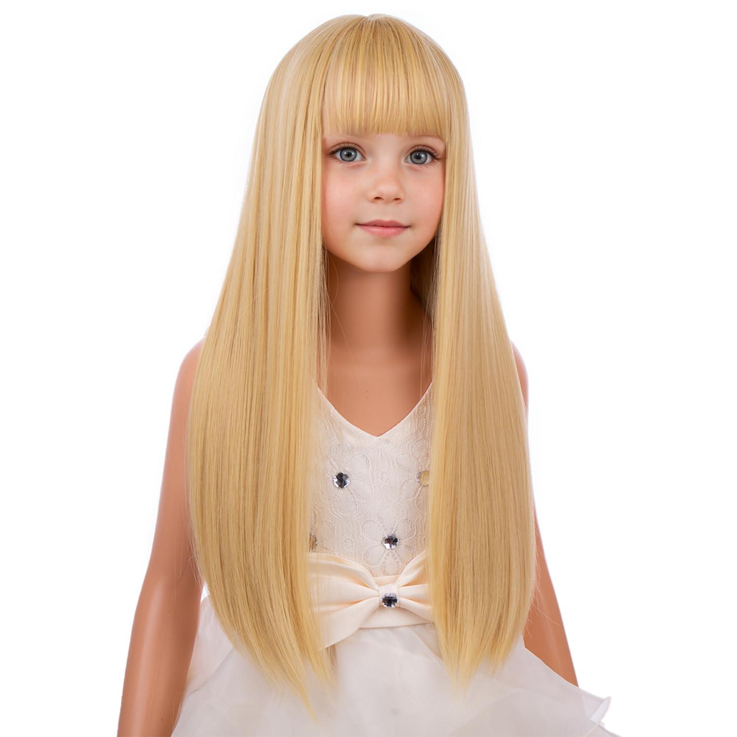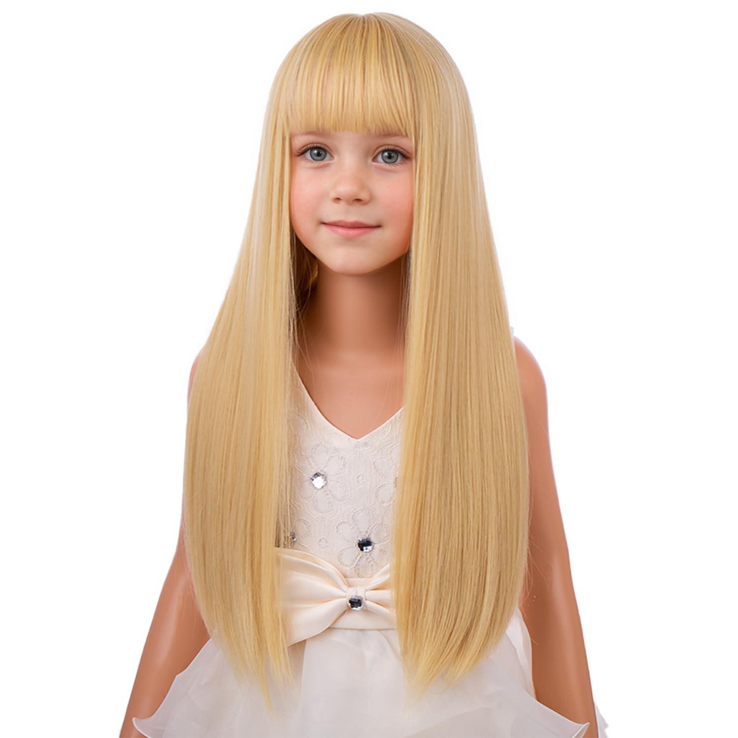 Kids Long Straight Blonde Wig with Bang Child Girls Blonde Long Wigs Synthetic Cosplay Party Synthetic Rose Net Wig(Mixed Blonde)