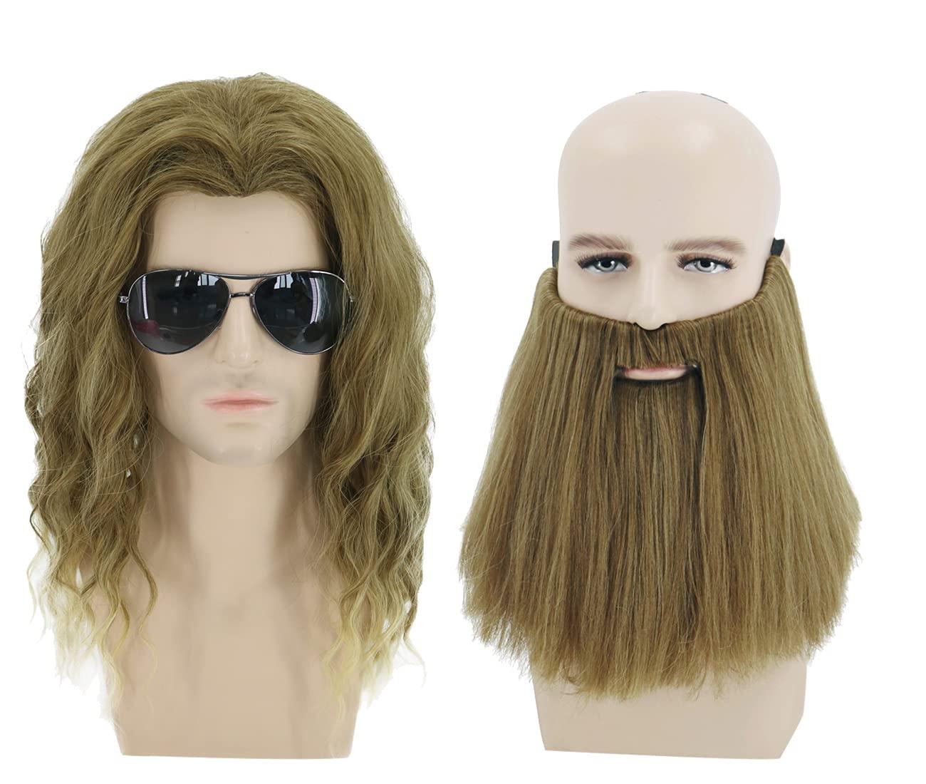 Mens Wigs and Beard Long Gray Wig for Men Long Gray Cosplay Halloween Costume Synthetic Wigs with Wig Cap(Golden Brown)