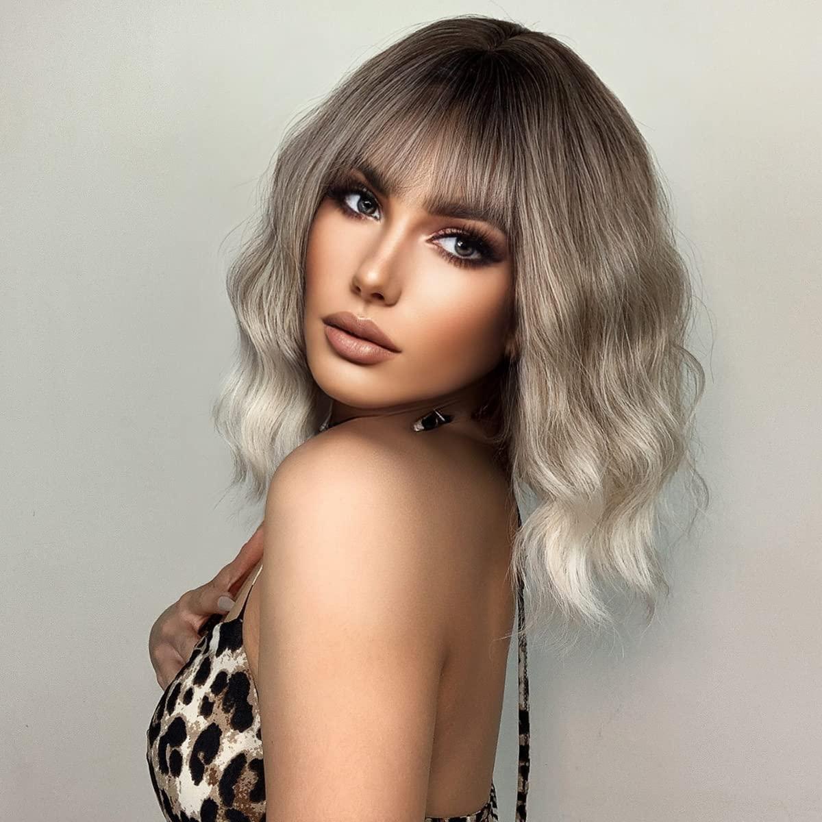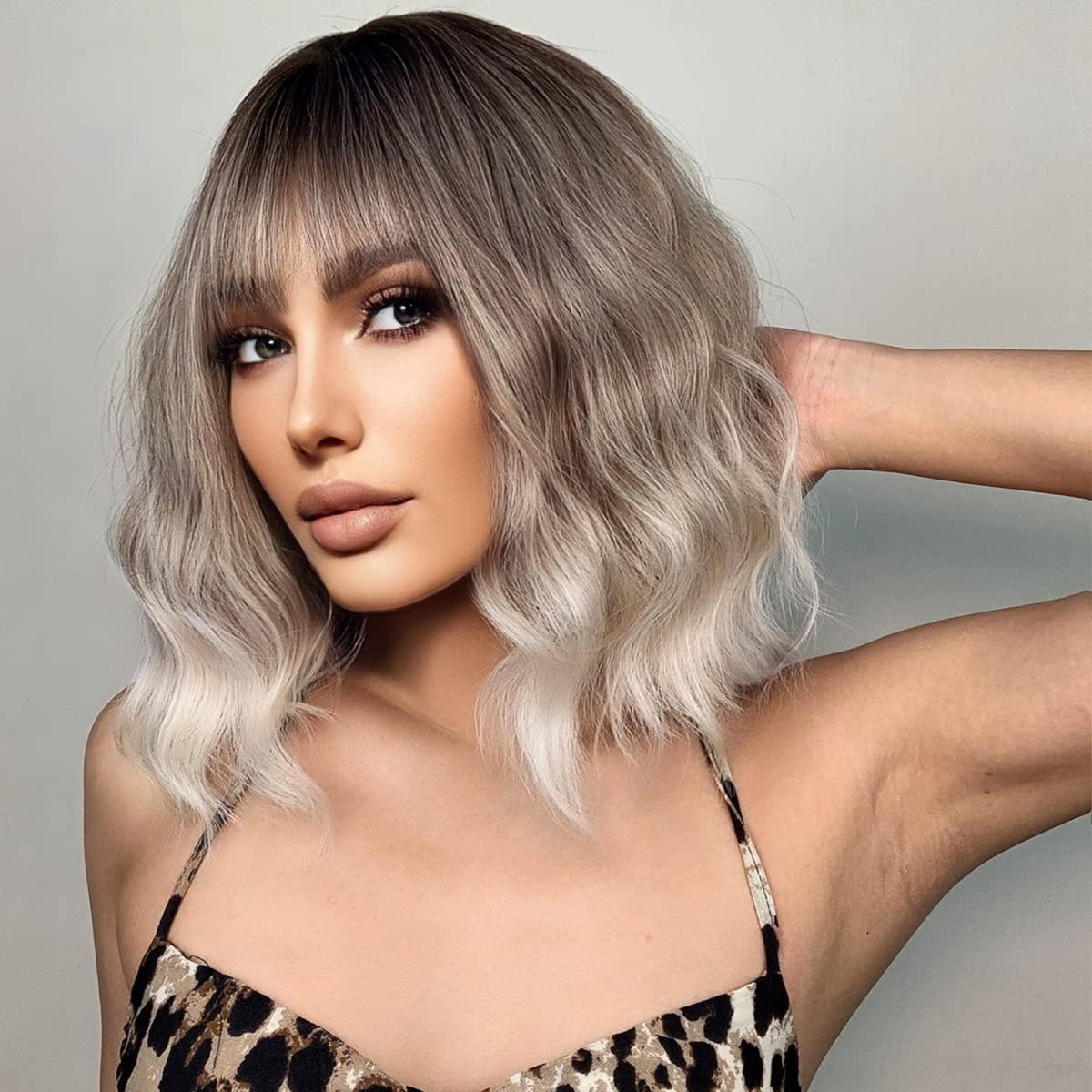 Short Ombre Blonde Wig for Women Short Curly Wavy Ombre Brown to Platinum Blonde Wigs with Bangs Ombre Blonde Bob Wig Heat Resistant Synthetic Wig with Wig Cap(Ombre Brown to Platinum)